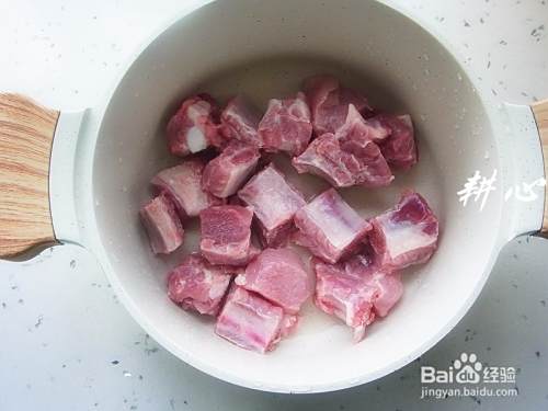择洗干净的肋排放入煮锅中。