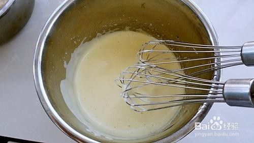 鸡蛋用电动打蛋器打发。(即提起打蛋器落下的蛋液不容易消失)