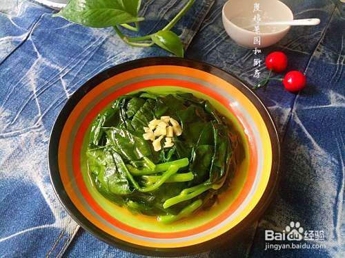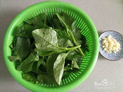木耳菜去除老梗洗干净控去水分,蒜瓣去皮后切碎。