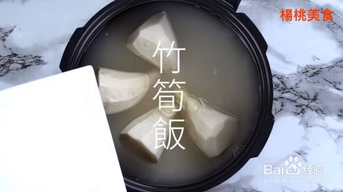 米与水一起入电锅,再放入去壳的竹笋。