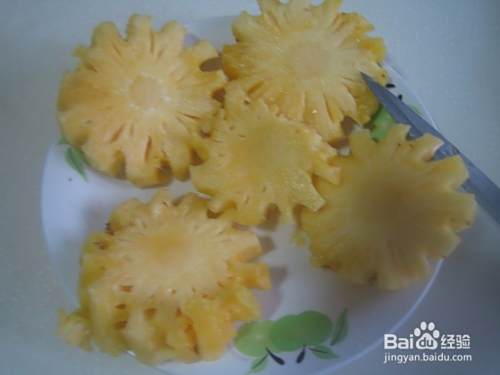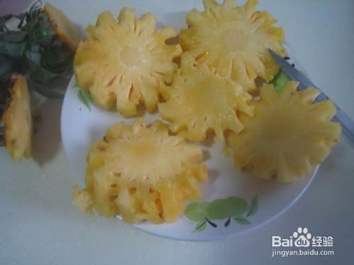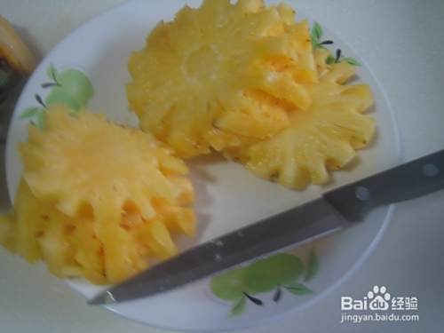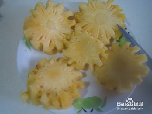 在准备用刀切菠萝的时候,要先将去外皮的菠萝用凉开水冲洗后放在干净的瓷盘用小长刀来切,左右手配合好后,就能切成均匀的菠萝段了。