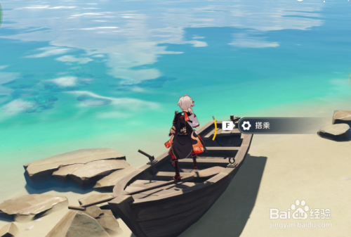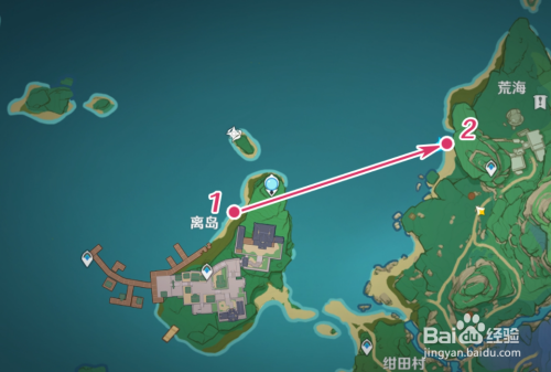 这只小船位于营地西面的海边,靠近后可以搭乘,会直接将我们传送到鸣神岛。搭乘后会把我们从1号位置送到2号位置,如下图所示。任务也就到这里就完成了。