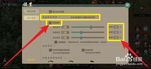勾选吃药保护,然后选择生命力、内力的最低值。战斗中低于设置的值后就会自动吃药