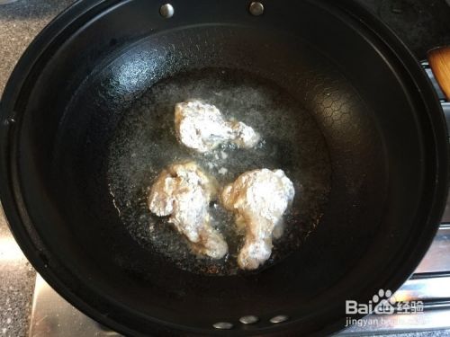 油锅热锅后,把沾2次粉的鸡翅根放入油锅里,用小火油炸,要不時翻动。