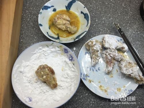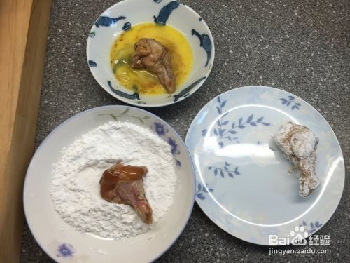 再重复沾一次,把沾粉的鸡翅根再沾蛋液后,再沾满粉。