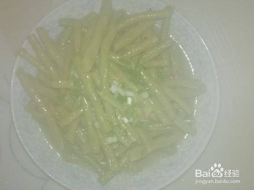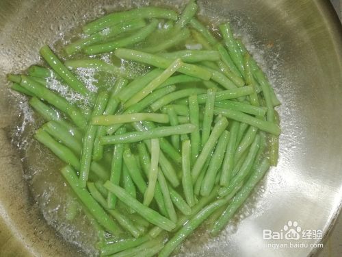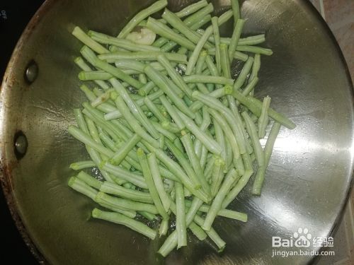 加入适量的盐,放少许的水,把豇豆炒变色。