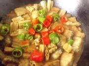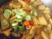 加入酱油、老抽、盐、糖,然后把腐竹倒进去,炖10分钟。