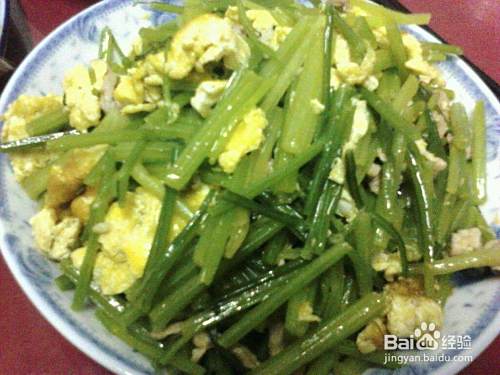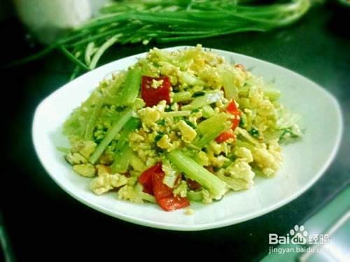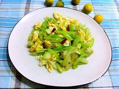 翻炒均匀之后把鸡蛋放入锅中,然后加入适量的盐和糖调味,美味的芹菜炒鸡蛋就做好了。