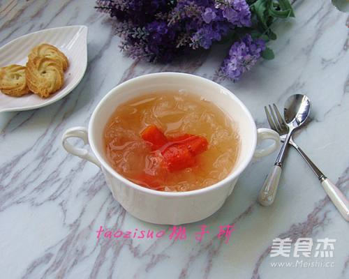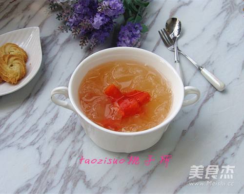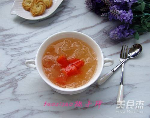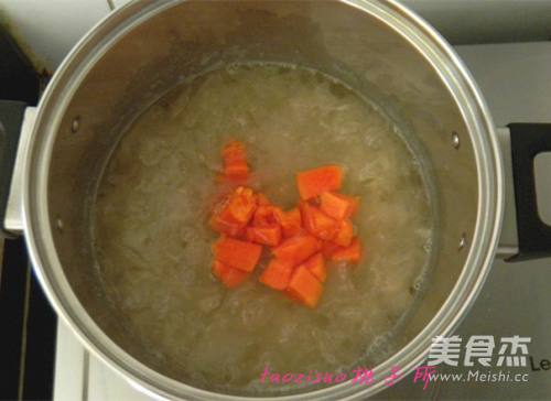 6待银耳羹里的冰糖融化后,放入木瓜粒,即可关火温度略降后即可食用,也可以晾凉后冰箱冷藏后食用。