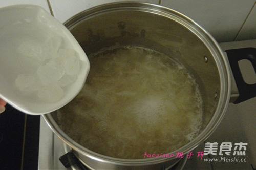 4待银耳熬制粘稠,倒入冰糖,冰糖的量根据自己喜欢的甜度放;
