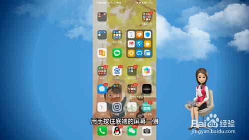 在华为手机的主界面中,用手按住底端的屏幕一侧。