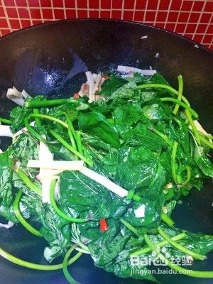 放入红薯叶,大火翻炒均匀至熟,中途可以少量加点清水