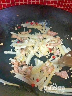 放入酸笋翻炒均匀,加入一勺生抽,让肉稍稍有点味道