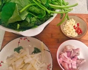 起锅热少量油,油热放入五花肉翻炒,尽量煸出五花肉的油脂,再放入小米椒和蒜末炒香