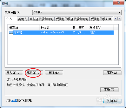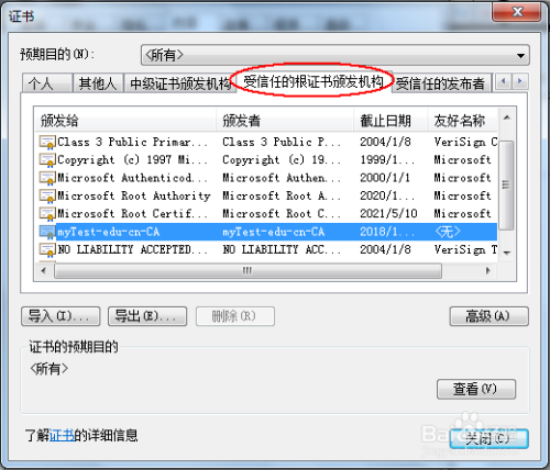 打开IE的“Internet选项”->“内容”->“证书”->“受信任的根证书颁发机构”