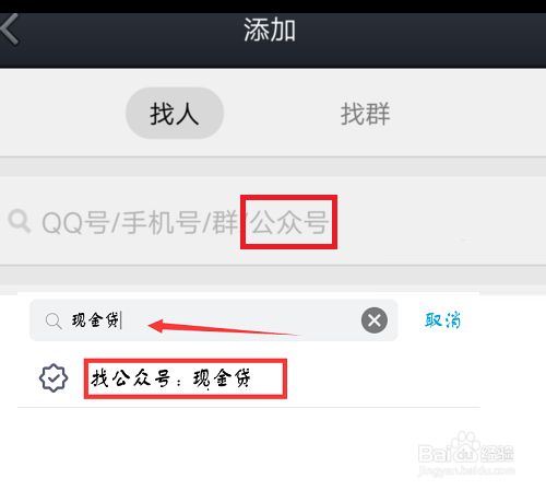 3在添加页面的搜索框中输入“现金贷”,点击下方出现的“找公众号”,即可进行公众号查找。