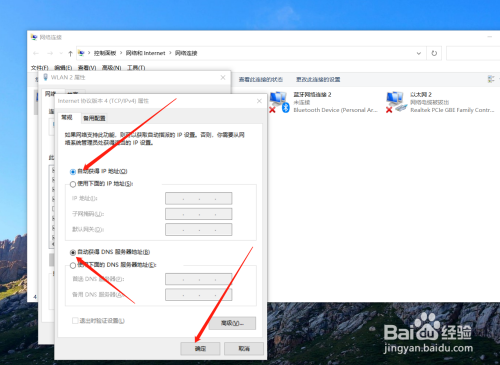 然后同时选中“自动获得IP地址”和“自动获得DNS服务器地址”点击确定即可