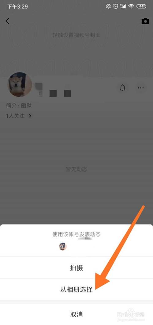 接着我们点击右上角的相机图标,在底部弹出列表,我们可以直接拍摄或者“从相册中选择”;