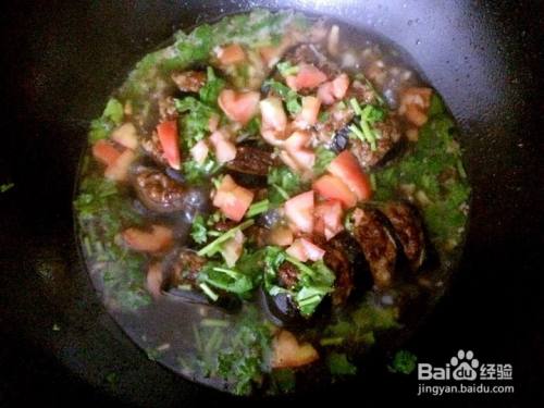 锅中剩底油,放入葱姜蒜爆香,再放入蚝油、味精等调料,然后将备好的茄子放入锅中。加适量的水将茄子煮熟,在大火收汁的时候,再放入西红柿丁和香菜。