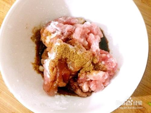 在肉馅中放入五香粉、盐、淀粉、生抽,进行搅拌,然后腌制15分钟。