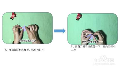 再把背面也这样折,然后再打开。用剪刀沿着折痕剪一下,再向里折小三角。