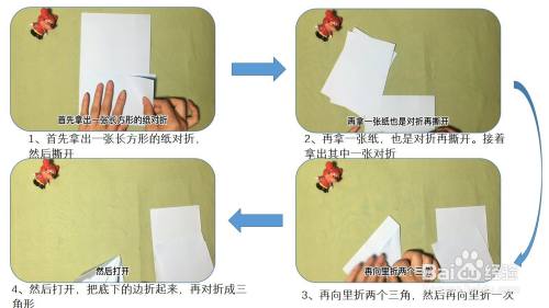 首先拿出一张长方形的纸对折,然后撕开,再拿一张纸,也是对折再撕开。接着拿出其中一张对折,再向里折两个三角,然后再向里折一次,然后打开,把底下的边折起来,再对折成三角形。