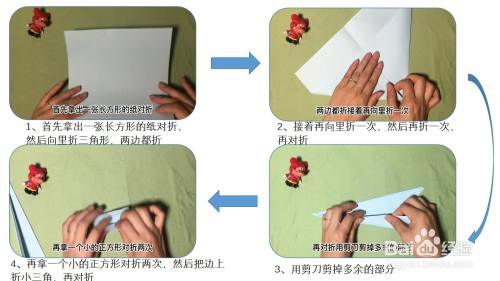 首先拿出一张长方形的纸对折,然后向里折三角形,两边都折,接着再向里折一次,然后再折一次,再对折。用剪刀剪掉多余的部分。再拿一个小的正方形对折两次,然后把边上折小三角,再对折。