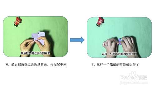 最后把角翻过去折到背面,再捏起中间。这样一个酷酷的暗器就折好了。