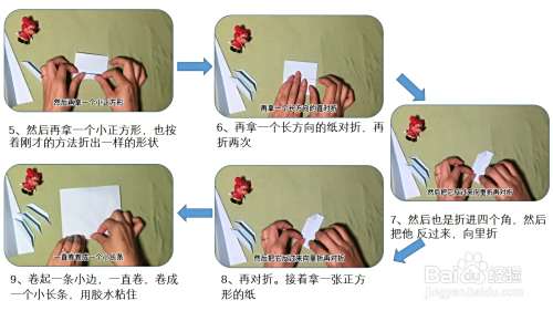 然后再拿一个小正方形,也按着刚才的方法折出一样的形状,再拿一个长方向的纸对折,再折两次,然后也是折进四个角,然后把他 反过来,向里折,再对折。接着拿一张正方形的纸,卷起一条小边,一直卷,卷成一个小长条,用胶水粘住。