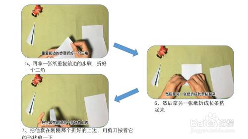 再拿一张纸重复前边的步骤,折好一个三角。然后拿另一张纸折成长条粘起来。把他套在刚刚那个折好的上边,用剪刀按着它的形状剪一下。