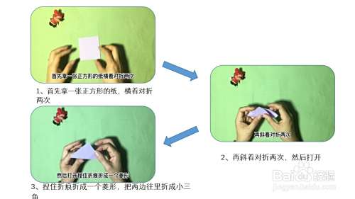 首先拿一张正方形的纸,横着对折两次,再斜着对折两次,然后打开,捏住折痕折成一个菱形,把两边往里折成小三角。