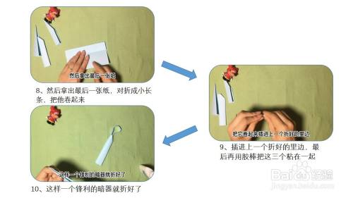 然后拿出最后一张纸,对折成小长条,把他卷起来,插进上一个折好的里边,最后再用胶棒把这三个粘在一起。这样一个锋利的暗器就折好了。