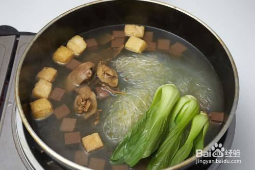 锅内倒入老鸭汤,中火煮开后依次放入鸭血、豆腐泡、泡好的龙口粉丝;