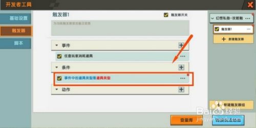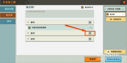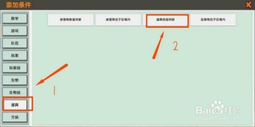5.我们不能随随便便消耗一个物品就可以召唤地心门,我们需要加入一个附属条件。点开条件后面的加号添加条件里面找到道具,选择道具判断类型。
