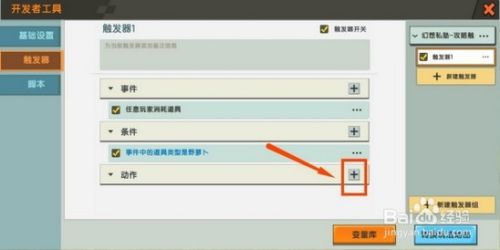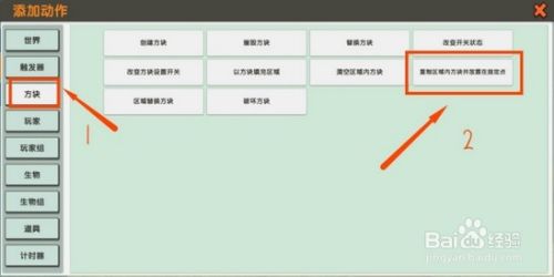 7.事件条件我们都设置好了,最后还差的就是动作。动作就是发生了什么,没有动作触发器就是无法执行的状态。点击动作后面的加号,添加动作里面在方框里找到,复制区域内的方块并放置在指定点。