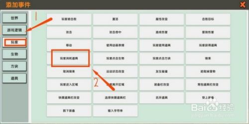 4.我们需要添加一个事件,使逻辑有效,事件就=做了什么。点击事件后面的加号,找到玩家选择玩家消耗物品。