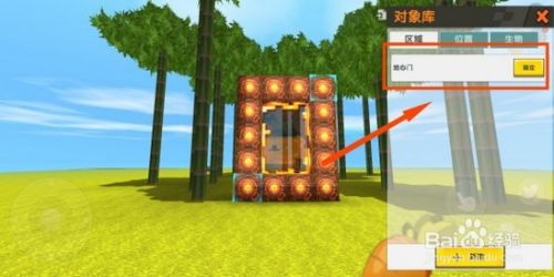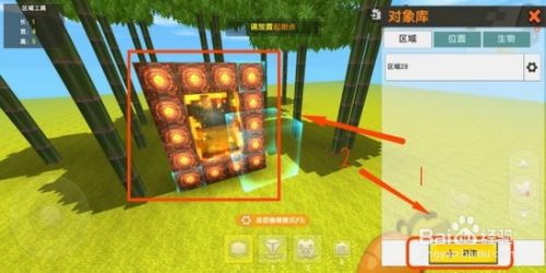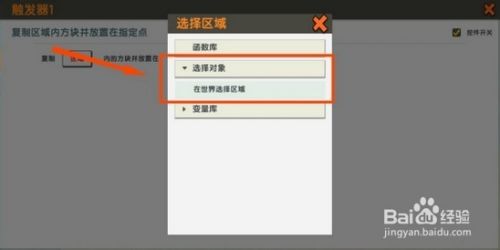 8.动作下面的绿色框框现在和条件之前哪里一样,点开,复制后面的区域选择,选择区域里,找到选择对象,在世界中选择。跳转到对象库后,选择之前框选住的地心门。