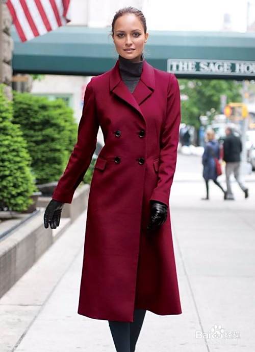 第四种,酒红色大衣,同样多为毛呢制品,这个颜色对于年轻人来说会很好,深灰和黑色会十分相称。