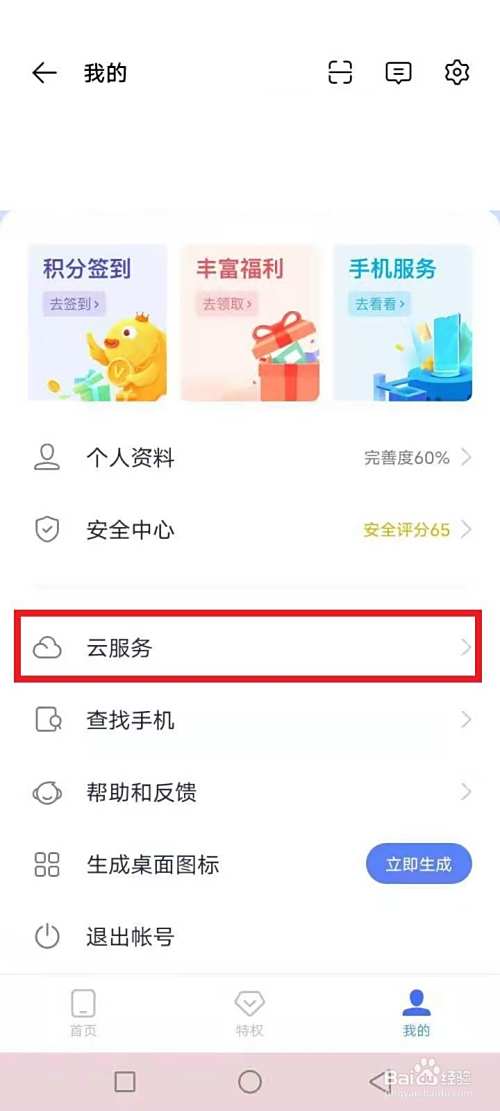 下拉手机服务中心页面,点击退出帐号,确定退出云服务。