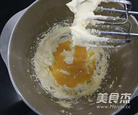 3将黃油打至发白变奶白色,再加入蛋液搅拌均匀。