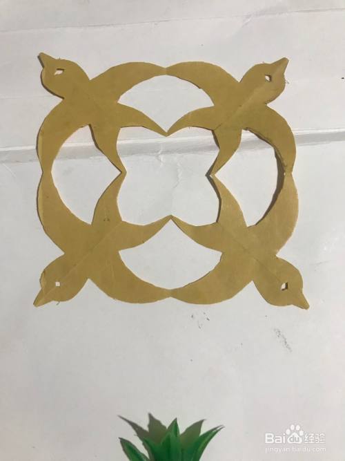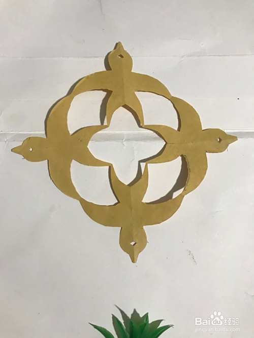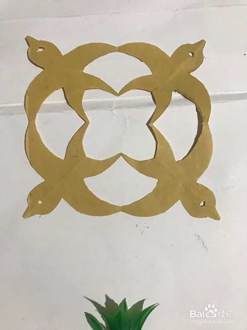 第六步 剪完外围多余的彩纸之后 再剪里面的细节部分和连接部分 镂空部分和其它涂实的部分等等 全部剪完之后 展开压平 一幅简单漂亮的小鸟团花图案就裁剪完成了