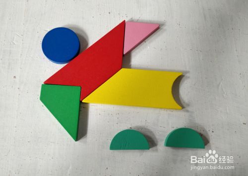 在红色形状的左上,放上圆形挨着,如图。一位游泳运动员就拼组完成了。