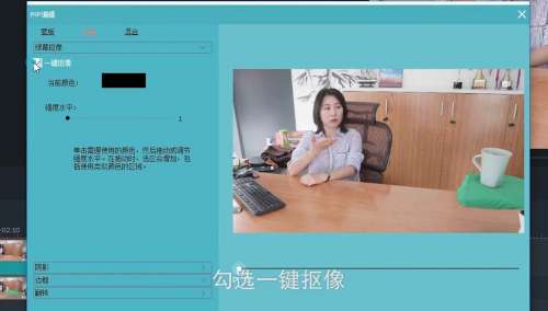 4将绿布素材拖拽到画中画轨道上,点击抠像图标,勾选“一键抠像”。