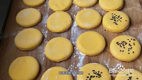 将面团取出撒上干粉,擀成饼状,用杯子按出形状,在表面撒上黑芝麻,盖上保鲜膜静置五分钟。