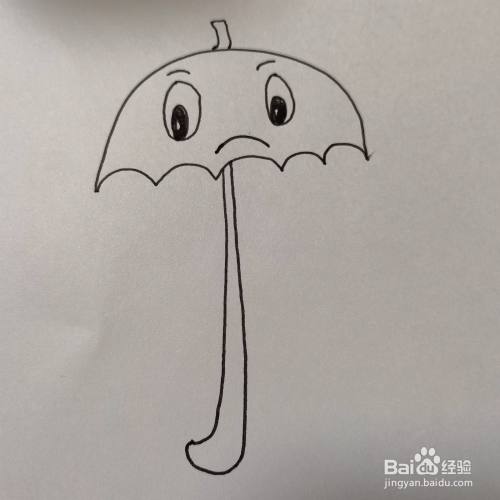 在雨伞的伞面上面画上向下弯弯的眉笔,大大的眼睛,和向下弯弯的嘴巴。