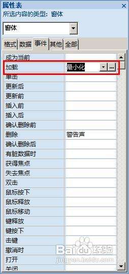 在数据表中,切换到事件选项,然后设置加载选项为:最小化。这是我们刚才建立的宏