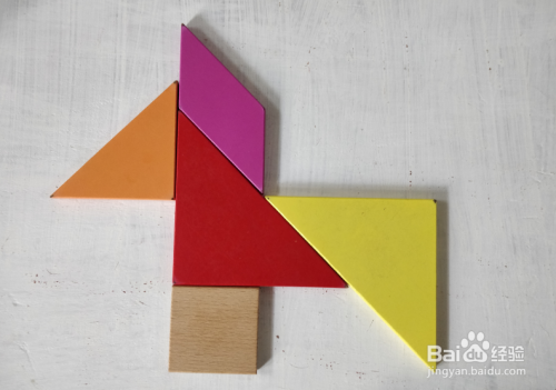摆上蓝色三角形,放在黄色三角形右侧挨着,如图。这样就拼组好了。
