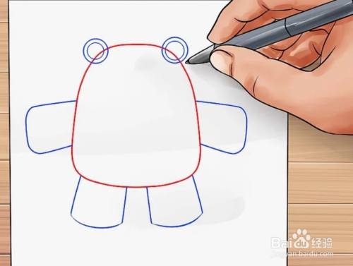 在圆角长方形的上方画两对一大一小的圈,这就是小熊的耳朵。