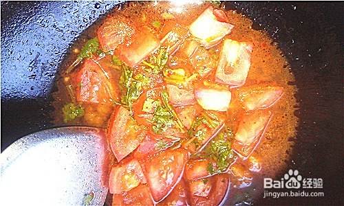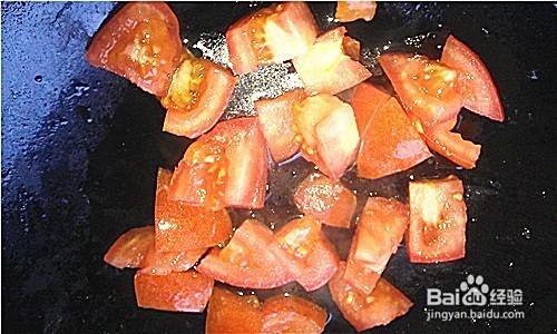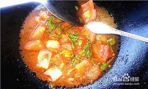 热锅凉油葱花爆香,放入西红柿丁煸出香味,放入调匀的料汁