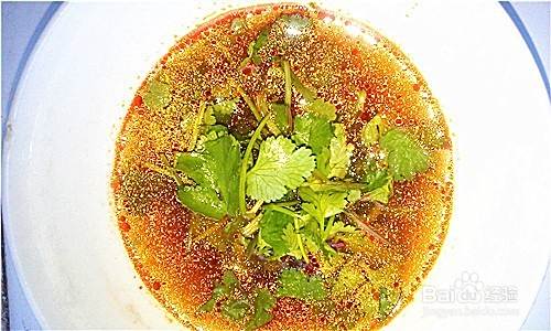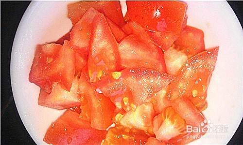 西红柿切成小丁,再调一个料汁,其中放入鲜辣酱、香醋、香菜,清水调匀
